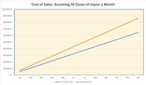 To better illustrate, please see the graph to the right. This assumes you are ordering 50 cases of liquor a month (600 bottles) and each bottle costs you 12 dollars and you sell your average drink for $10. The difference in your beverage cost between a 1.5 oz pour and a 2.0 pour ends up being $1,800 a month, or $21,600 over the course of a year, out of your pocket.